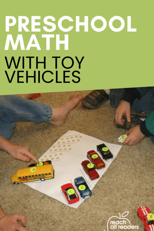 Our beautiful spring weather has taken a turn for the worse, so we’re spending some time indoors. Today was the perfect time to round up some preschool math ideas using toy vehicles.