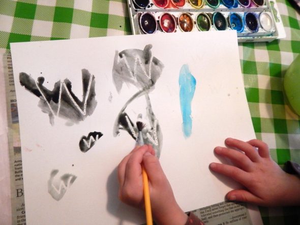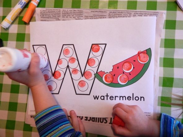 This was another fun watercolor activity. I wrote the letter W all over a piece of cardstock using white crayon. Then my daughter hunted for them by painting on the page. She loved this!