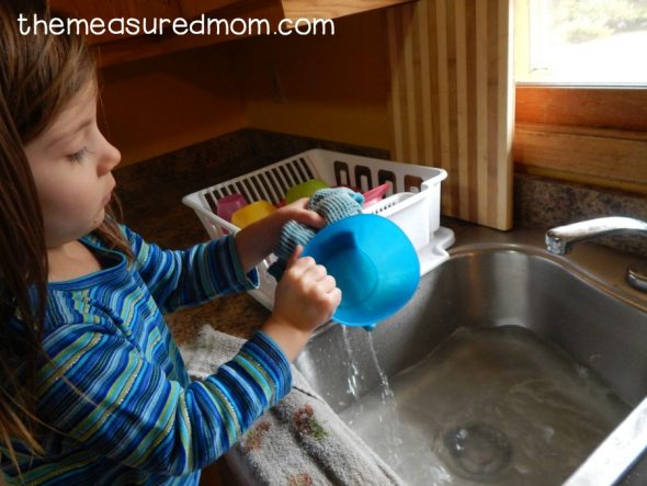 This review activity was easily her favorite one of the week. I simply wrote letters on our plastic dinnerware with a dry erase marker. Then she named the letters as she washed them off. I have Growing Book by Book to thank for this brilliant idea!