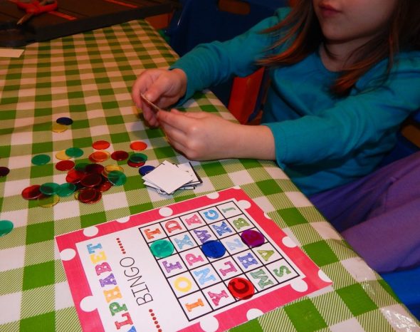 I printed this free Alphabet Bingo from Crazy Little Projects. I would say it was a little too advanced for my toddler, even though she could name most of the letters. I think the problem is that the board was too small and crowded. But she did enjoy doing it together.
