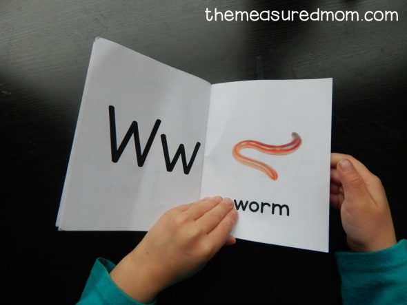 This is from our set of free alphabet books. I love listening to her name all the pictures! “Wehm.”