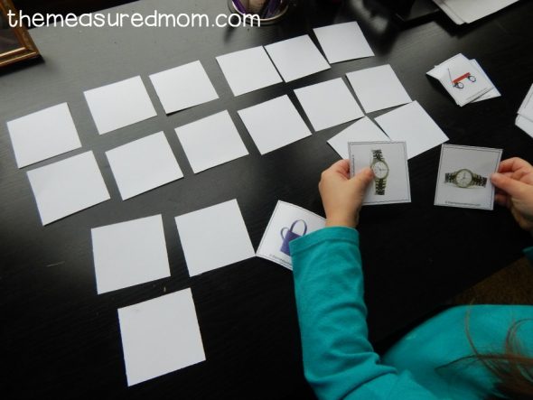 I printed two sets of photo cards you can get at the end of this post. My toddler enjoyed finding matches and setting them aside.