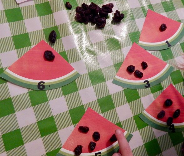 We tried these watermelon counting mats that I downloaded at From ABC’s to ACTs. I helped my daughter count raisins for each mat. She could recognize about half of the numbers from 1-6. She needed help counting groups of raisins higher than three.
