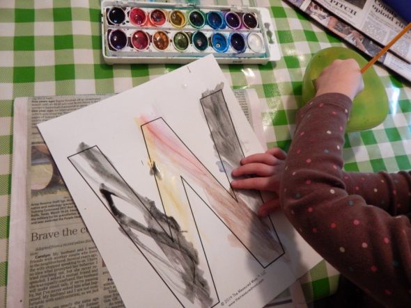 I printed a block letter L, and my daughter colored it using water paint.