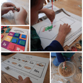 Our curriculum includes lessons for teaching both upper and lowercase letter names and sounds. You’ll get three lessons per letter, built-in review, simple handwriting practice, rhyming, syllable counting, phonemic awareness, and a whole lot more!