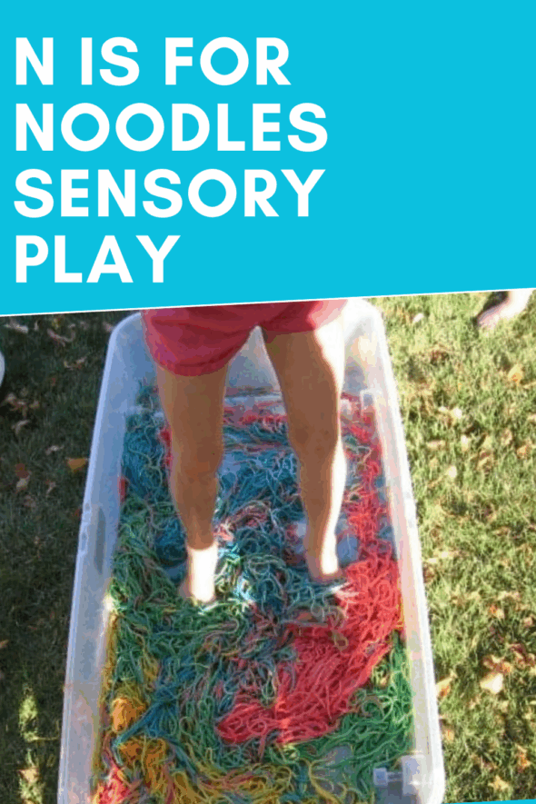 We’re working our way through the alphabet, and my kids love to add some sensory play to their learning. This time I waited until my Six was home from first grade, because I knew she’d want to join her little brothers in this activity: N is for Noodles!