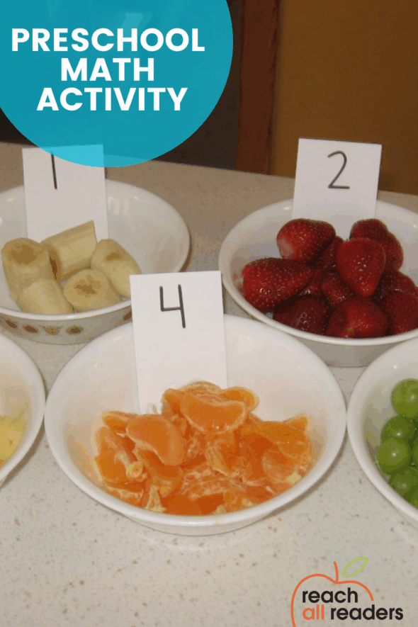My Two can count to 10 correctly, but he’s not good at one-to-one correspondence. This gave us a lot of practice with that. He loved the one-on-one time and was proud to say that he made the fruit salad. You can make this harder for older kids by writing the recipe on a sheet of paper instead of labeling each bowl (that was actually my original idea until I realized that this would be better for him).